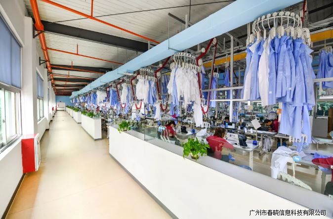 裁切完成后,裁片会被标识上电子标签,进入智能吊挂系统。智能吊挂系统将身份标签通过扫码与吊挂线衣架信息进行绑定,以效率优先的标准来判定并分配产品站位,实现生产线的可视化管理和信息化管理。吊挂系统串联整个生产流程,高效智能的运转可以使操作人员手持量减少90%,较传统生产模式效率提高近25%。