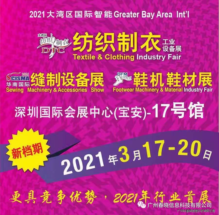 欢迎参观2021大湾区国际智能纺织制衣工业设备展DTC、华南国际缝制设备展SCISMA??William希尔官网科技将于3月17-20日在深圳国际会展中心(宝安新馆)举行,展览规模5万平方米,逾450家知名企业同台亮相,向业界展现当今世界纺织制衣制鞋最新智能技术及设备,响应国家双循环号召,与大家共同迎接市场复苏旺季。
